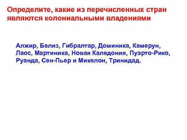 Описание слайда:Определите, какие из перечисленных стран являются колониальными владениями Алжир, Белиз, Гибралтар, Доминика, Камерун, Лаос, Мартиника, Новая Каледония, Пуэрто-Рико, Руанда, Сен-Пьер и Микелон, Тринидад.