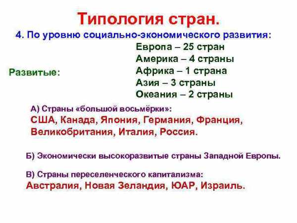 Типология стран. 4. По уровню социально-экономического развития: Европа – 25 стран Америка – 4 страны Африка – 1 страна Развитые: Азия – 3 страны Океания – 2 страны А) Страны «большой восьмёрки» : США, Канада, Япония, Германия, Франция, Великобритания, Италия, Россия. Б) Экономически высокоразвитые страны Западной Европы. В) Страны переселенческого капитализма: Австралия, Новая Зеландия, ЮАР, Израиль.