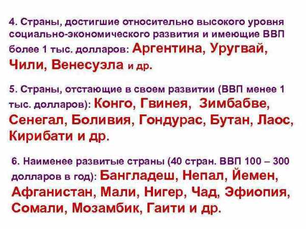 4. Страны, достигшие относительно высокого уровня социально-экономического развития и имеющие ВВП более 1 тыс. долларов: Аргентина, Уругвай, Чили, Венесуэла и др. 5. Страны, отстающие в своем развитии (ВВП менее 1 тыс. долларов): Конго, Гвинея, Зимбабве, Сенегал, Боливия, Гондурас, Бутан, Лаос, Кирибати и др. 6. Наименее развитые страны (40 стран. ВВП 100 – 300 долларов в год): Бангладеш, Непал, Йемен, Афганистан, Мали, Нигер, Чад, Эфиопия, Сомали, Мозамбик, Гаити и др.