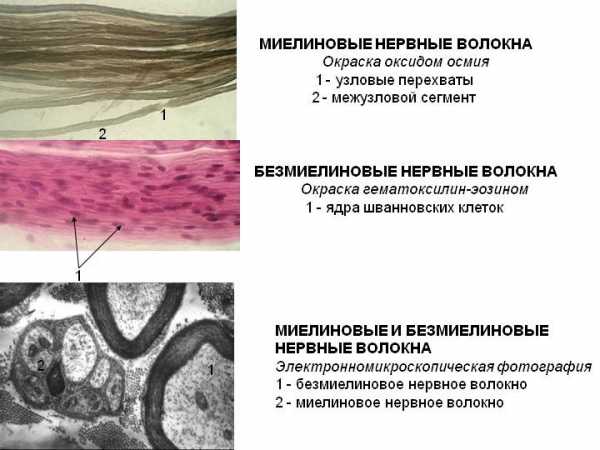 Различают миелиновые и безмиелиновые волокна. Отросток – осевой цилиндр (аксон). В ЦНС оболочки отростков образуют олигодендроциты, в ПНС – нейролеммоциты.