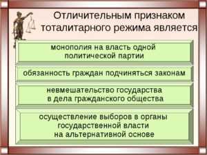 Из всего перечисленного политологи выделяют отсутствие прав и свобод, единую идеологию как основу.